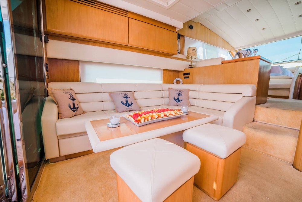 The maximum capacity of the yacht is 20 passengers, with six berths in three cabins. A comfortable lounge area for lunch, a flybridge from where you can enjoy the panoramic views of Cyprus, as well as any other location on the yacht will keep delighted everyone, who cherishes comfort of a boat trip.
