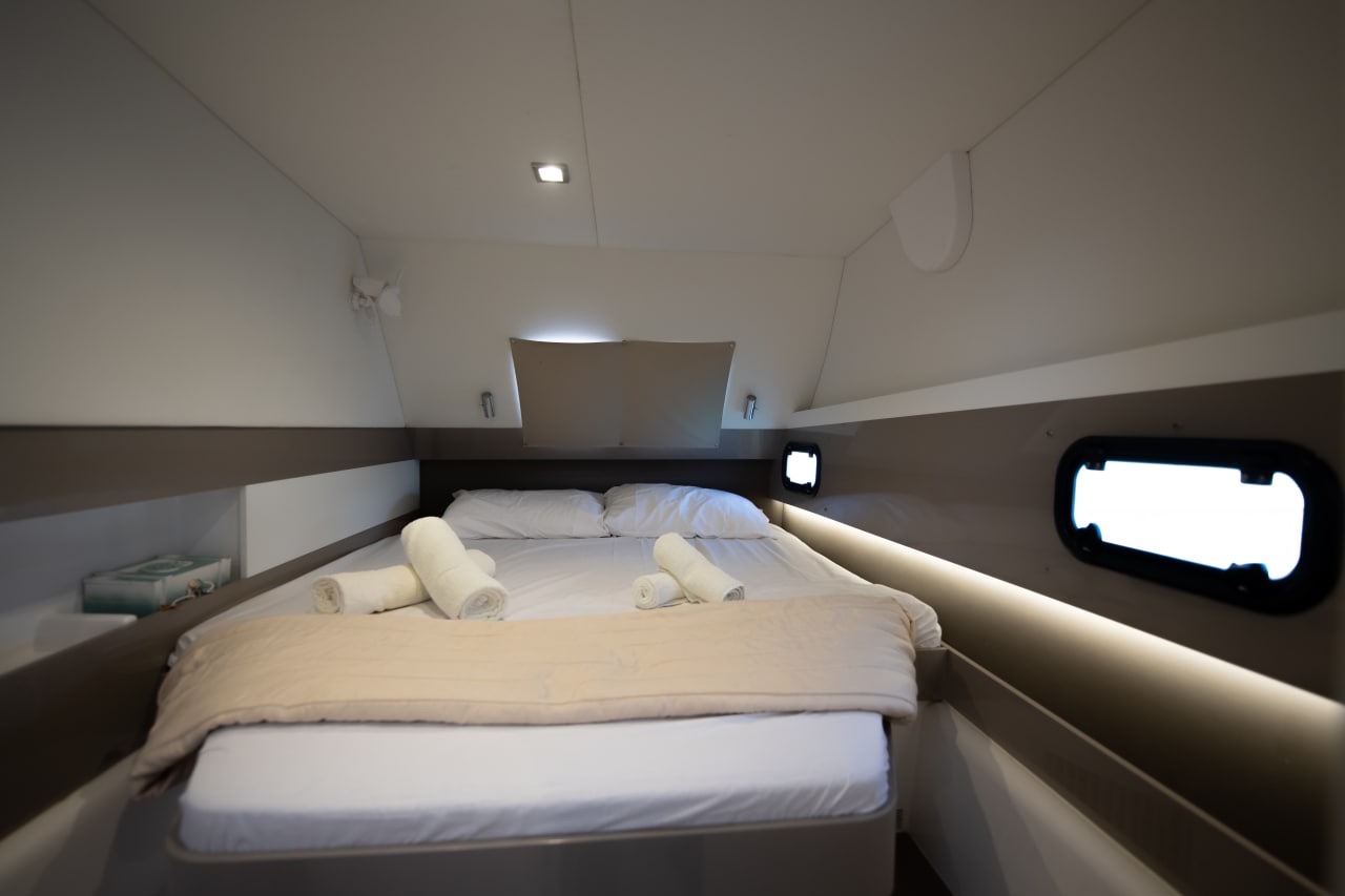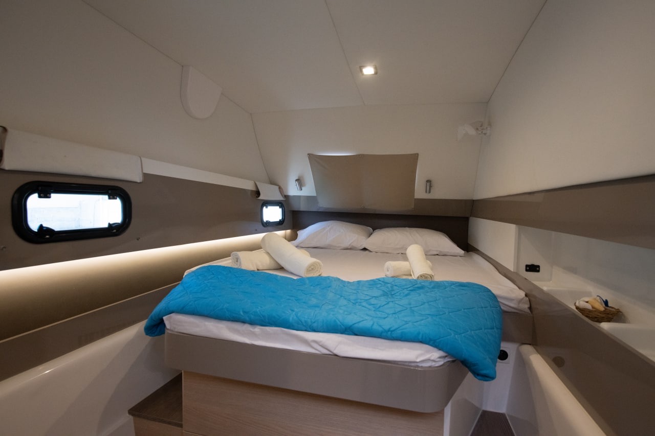 The Catamaran is unique due to its modern design and panoramic windows.The spacious lounge area on the flybridge of the Catamaran will make your cruise unforgettable. The catamaran is technically equipped with everything necessary for a comfortable and carefreeboat trip.