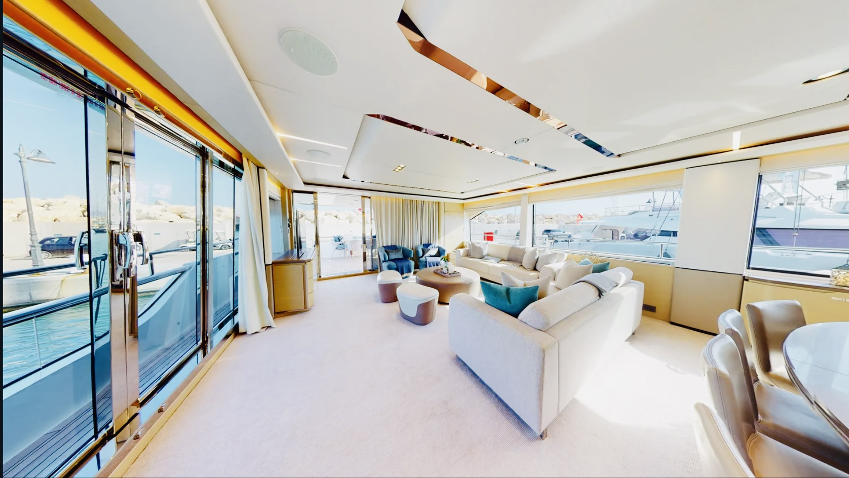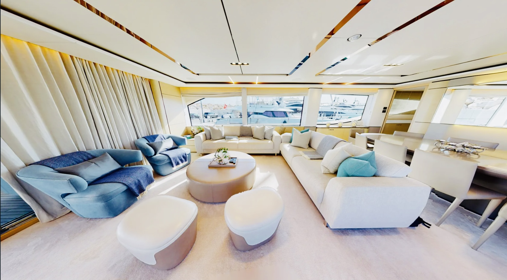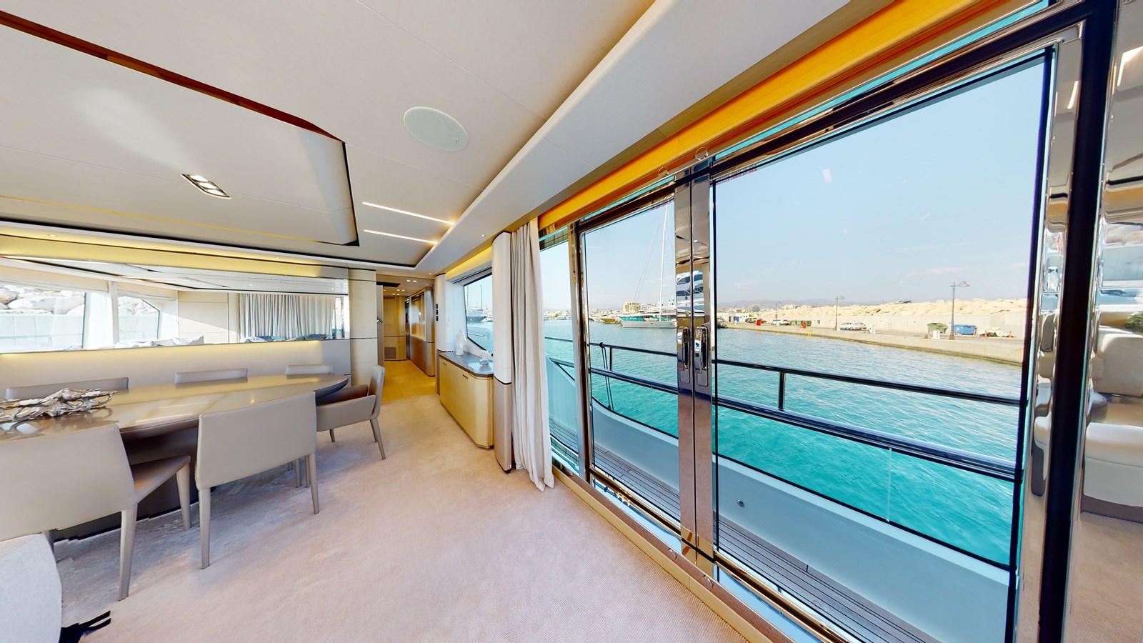 Inside, the main salon features a custom decor with an alluring light scheme, combining ivory white furnishings with accents of marine sea blue and pale wood. The spacious open-plan saloon boasts a generously proportioned lounge area that takes advantage of the panoramic views through customized sliding doors. The mid-positioning of the salon provides a triple aspect, allowing an abundance of natural light to filter through. The oval dining table can seat up to 10 guests.