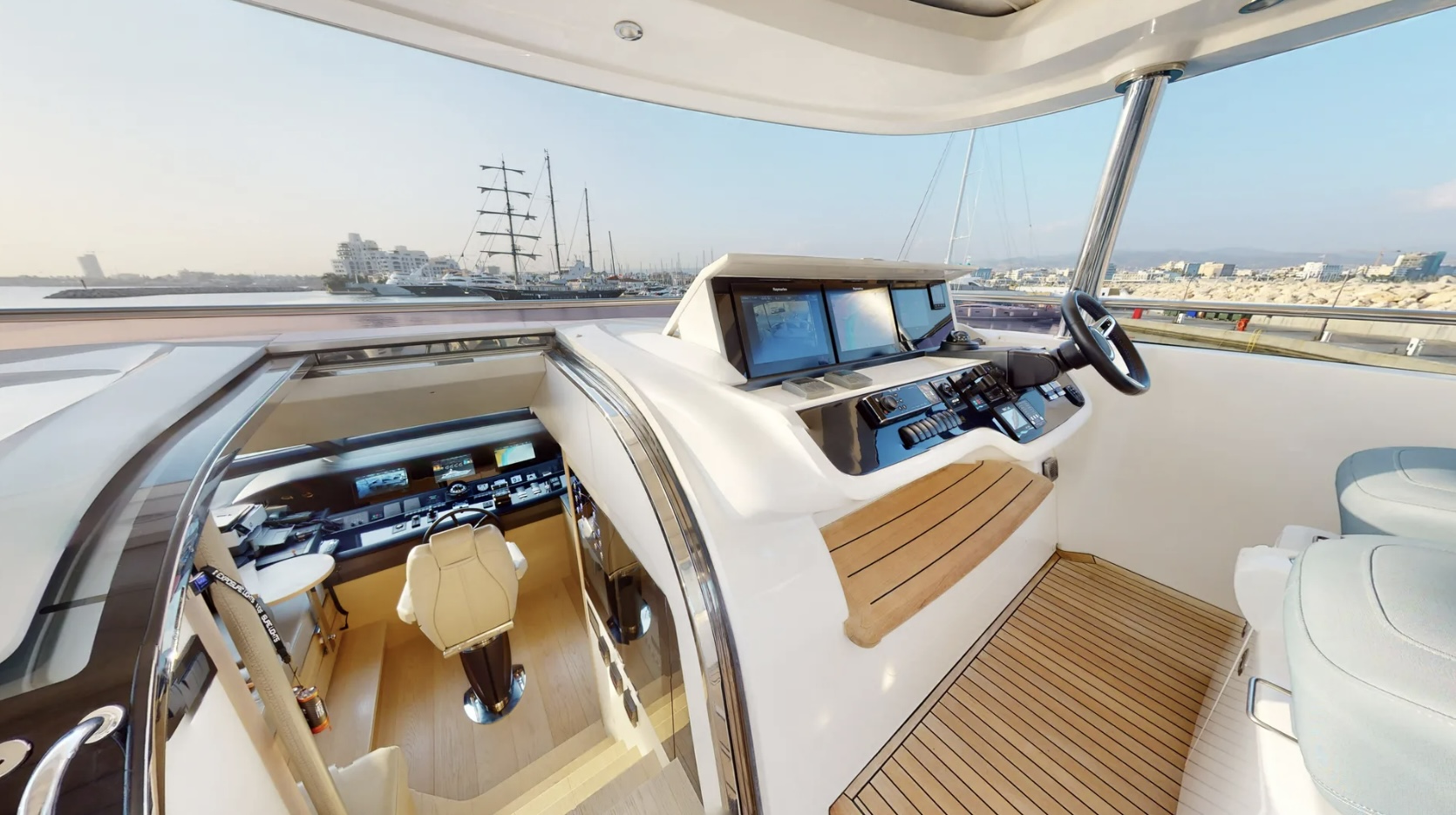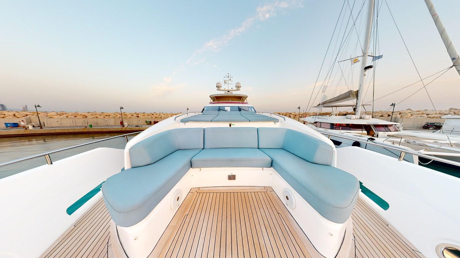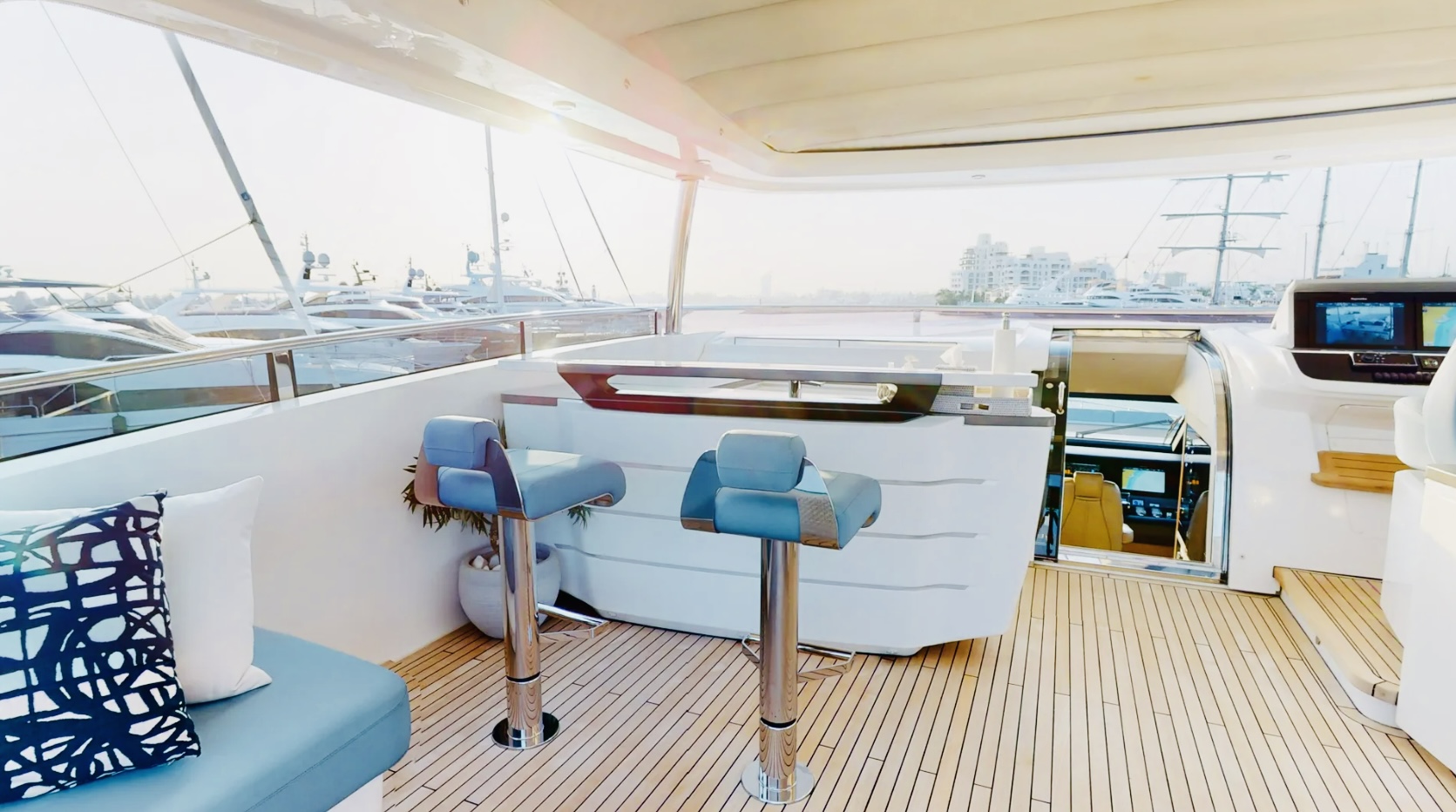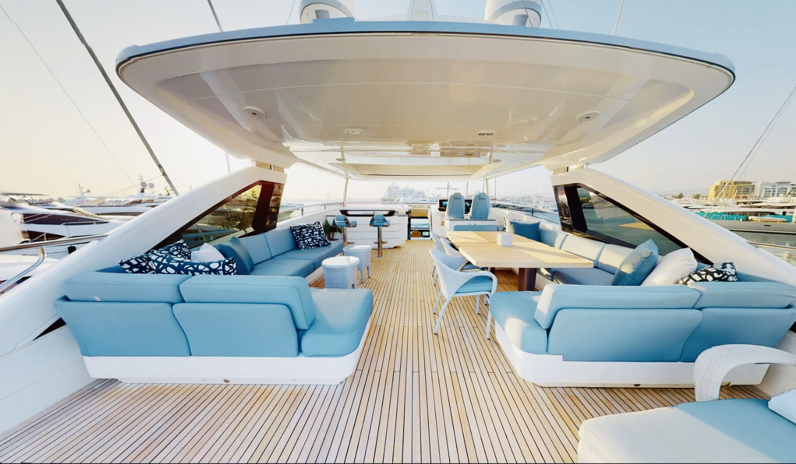 Inside, the main salon features a custom decor with an alluring light scheme, combining ivory white furnishings with accents of marine sea blue and pale wood. The spacious open-plan saloon boasts a generously proportioned lounge area that takes advantage of the panoramic views through customized sliding doors. The mid-positioning of the salon provides a triple aspect, allowing an abundance of natural light to filter through. The oval dining table can seat up to 10 guests.