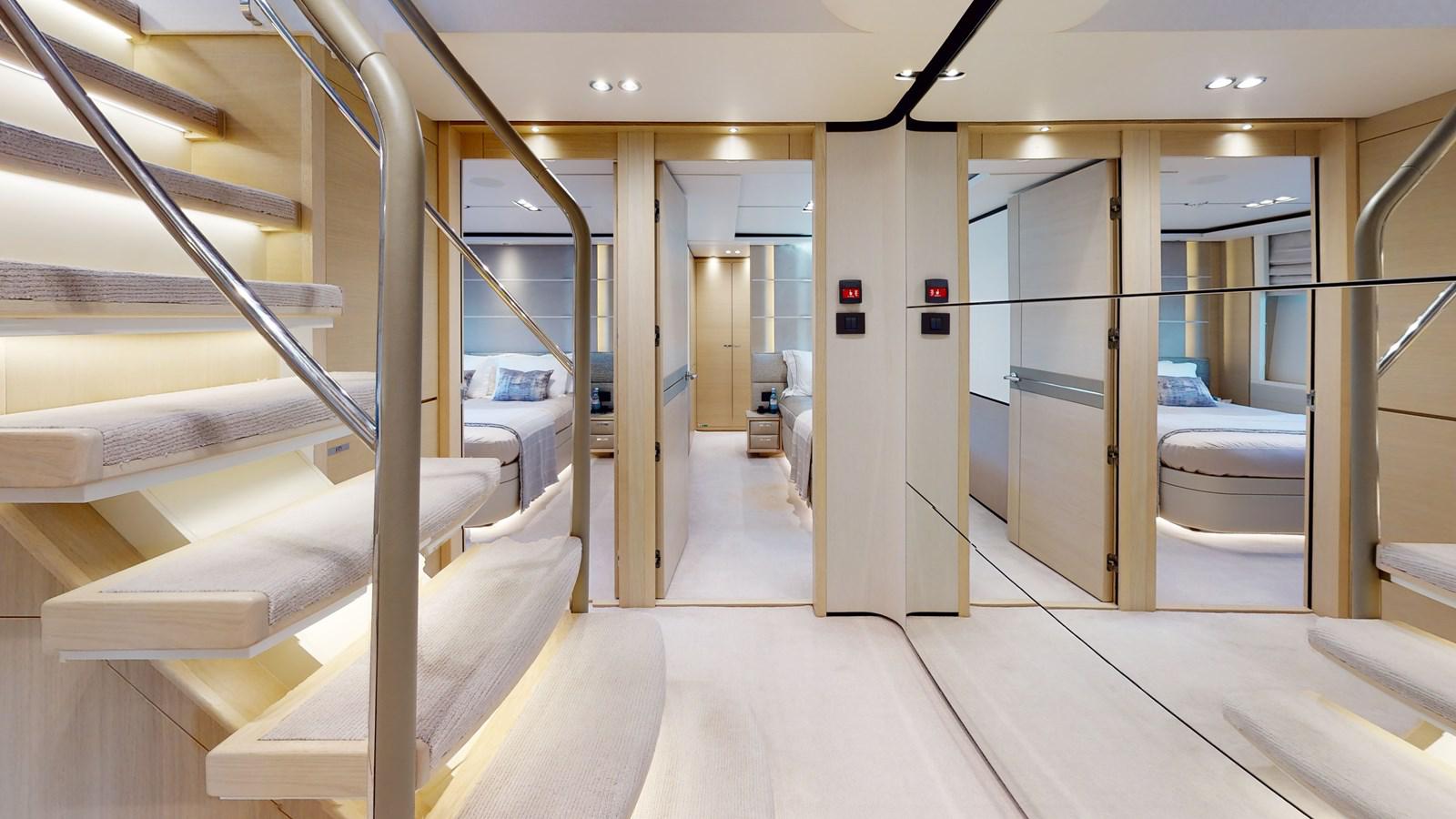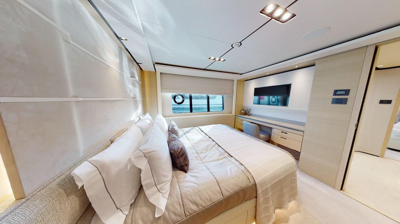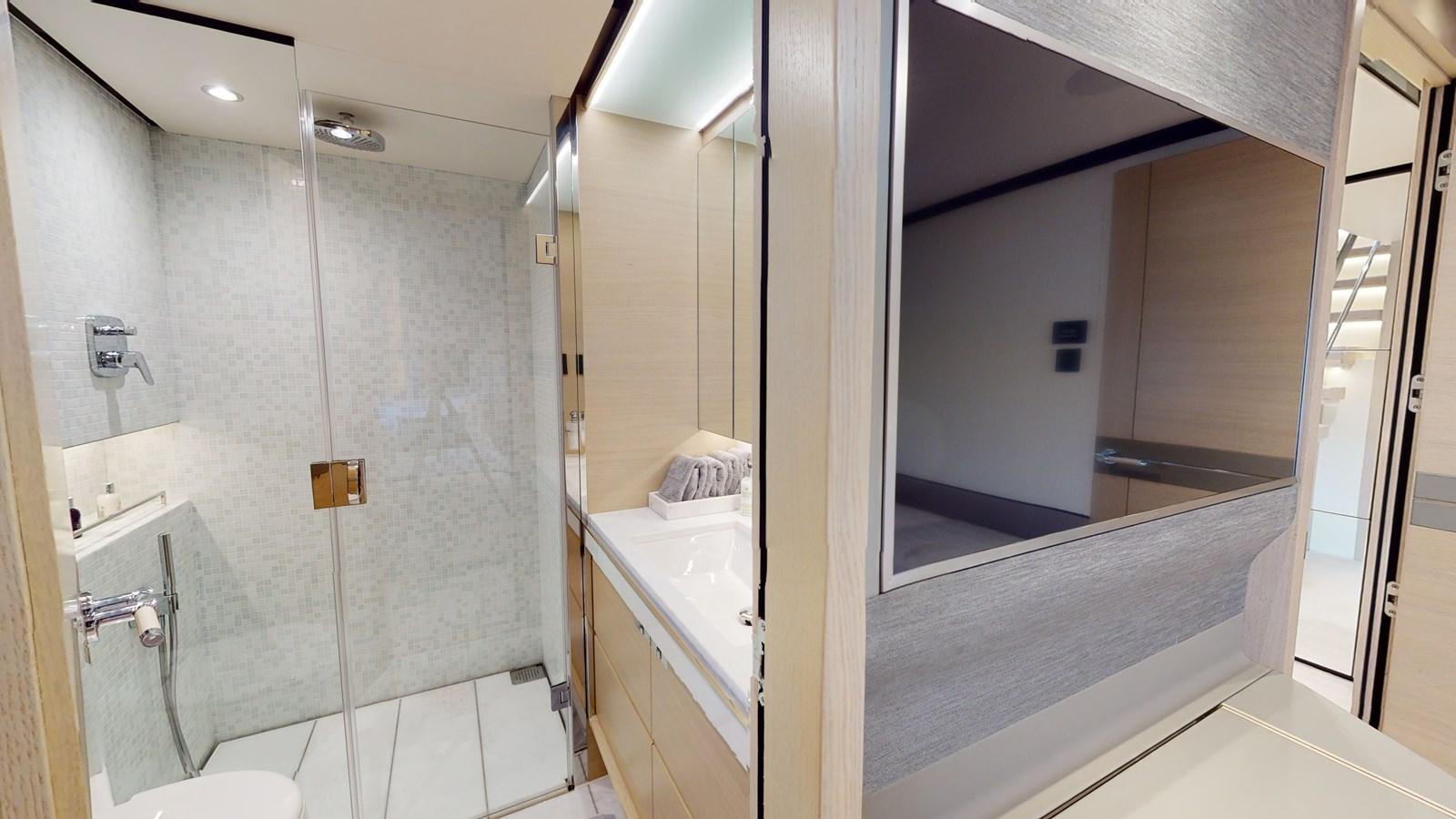 The main deck master cabin is bathed in natural light, thanks to its full-height windows and stunning skylight, providing uninterrupted views. Smart furniture design solutions have been incorporated to maximize storage capacity without impeding the room's spaciousness. A beautifully formed breakfast table allows guests to enjoy their morning coffee, while the master bathroom features his and hers sinks, a voluminous walk-in shower with a stylish custom Siminetti mosaic, and inbuilt speakers.