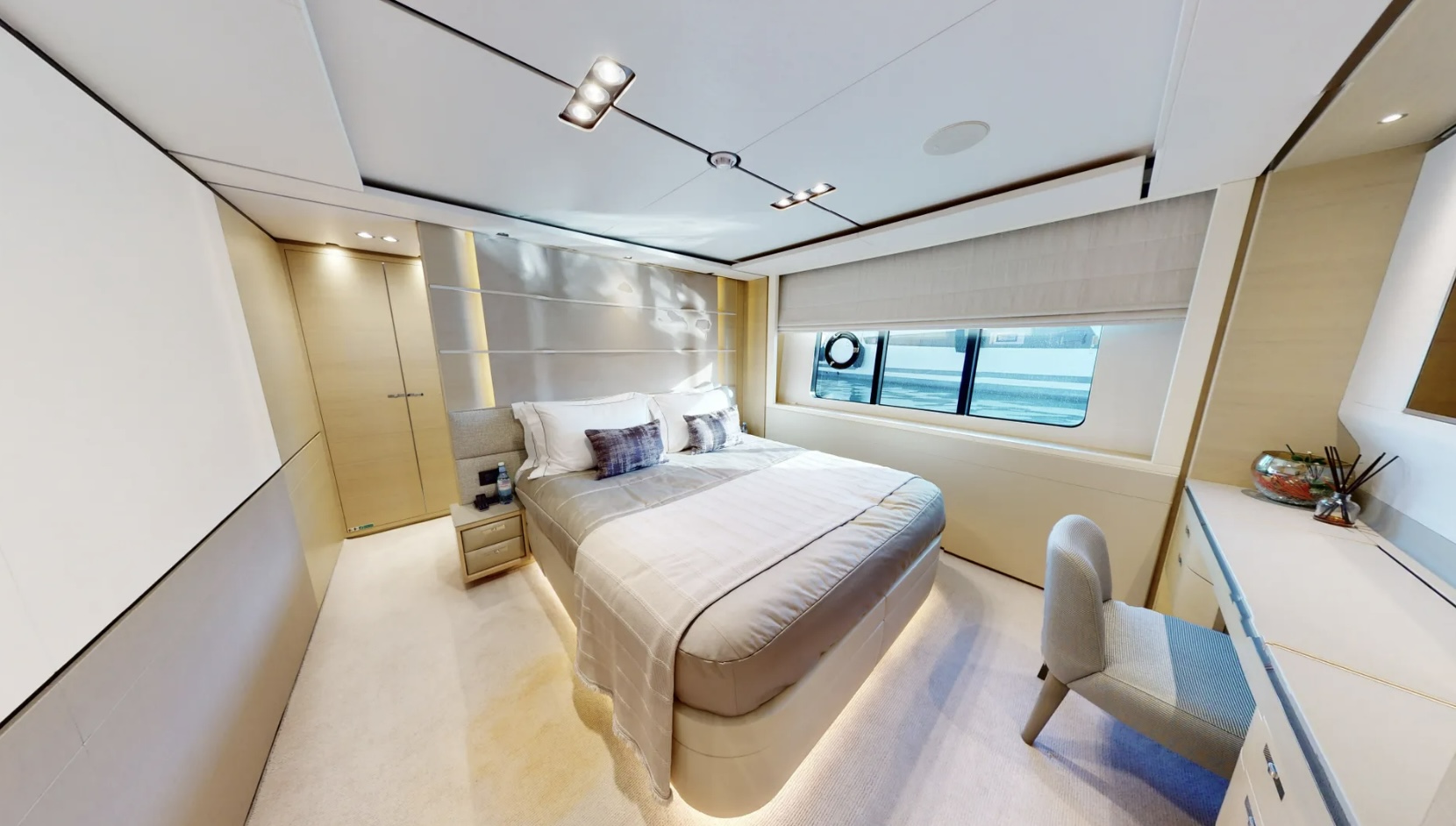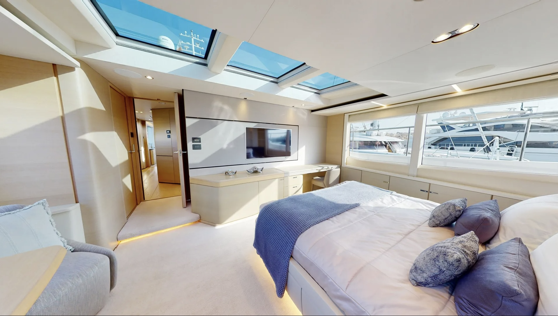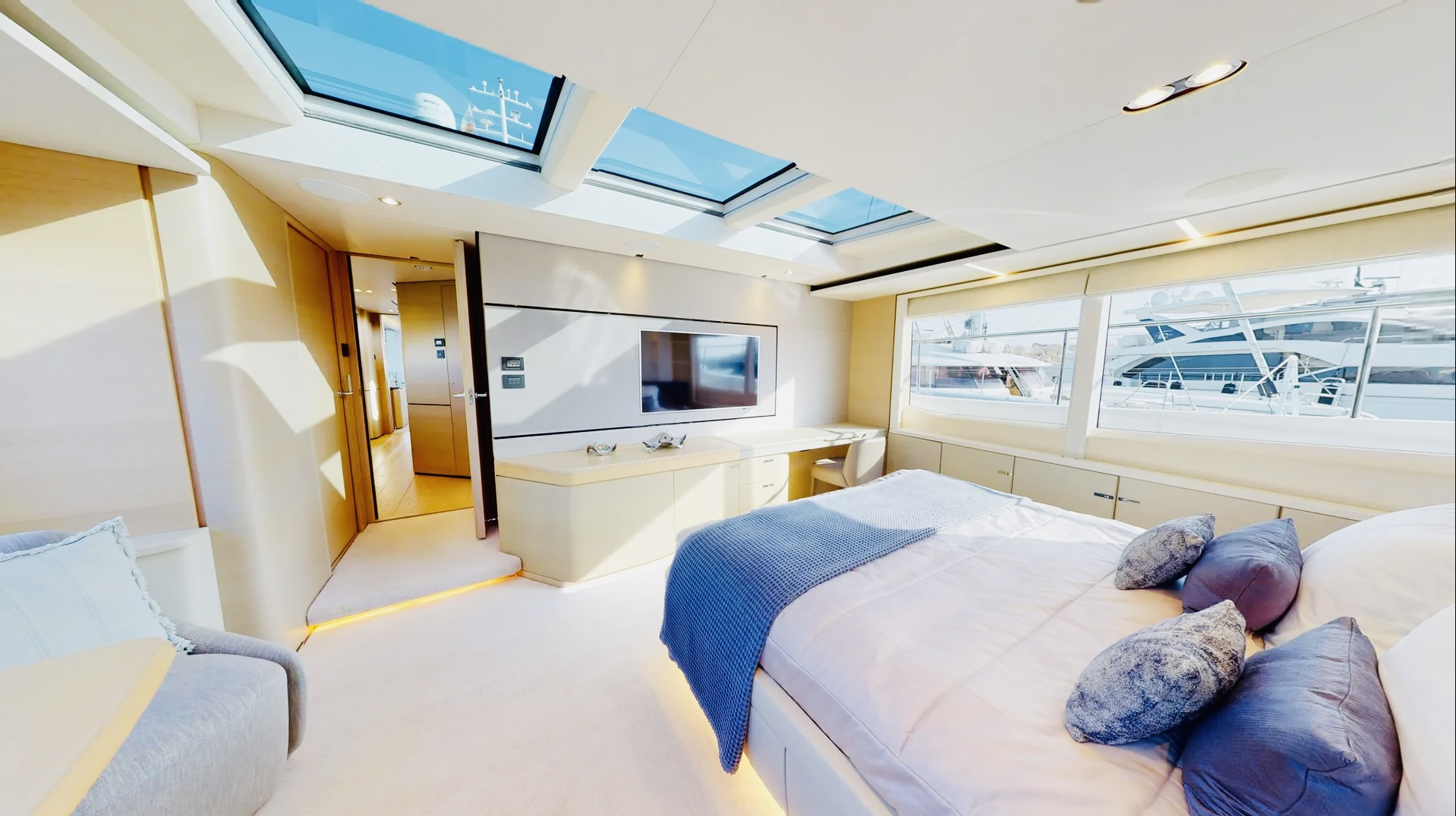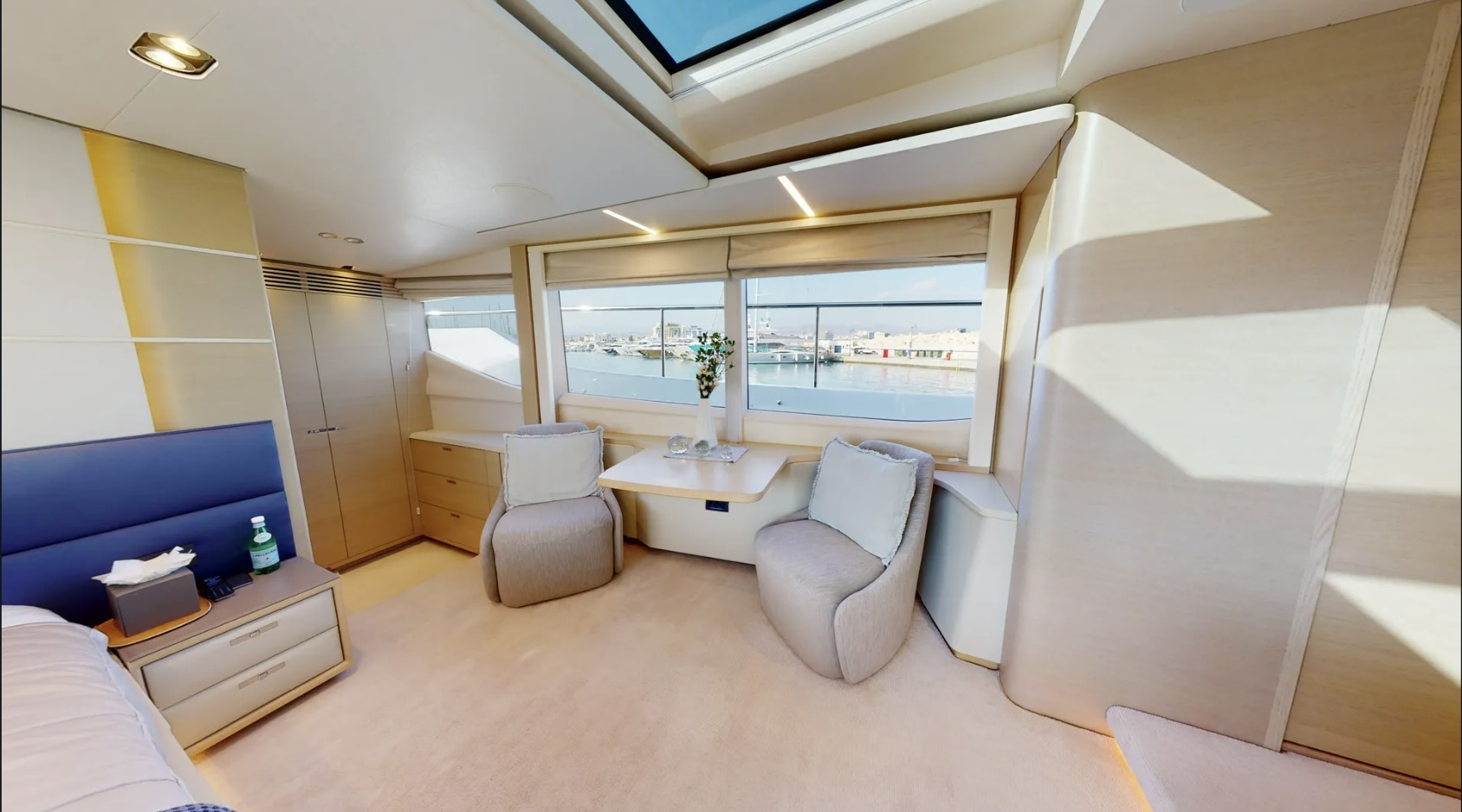 The main deck master cabin is bathed in natural light, thanks to its full-height windows and stunning skylight, providing uninterrupted views. Smart furniture design solutions have been incorporated to maximize storage capacity without impeding the room's spaciousness. A beautifully formed breakfast table allows guests to enjoy their morning coffee, while the master bathroom features his and hers sinks, a voluminous walk-in shower with a stylish custom Siminetti mosaic, and inbuilt speakers.