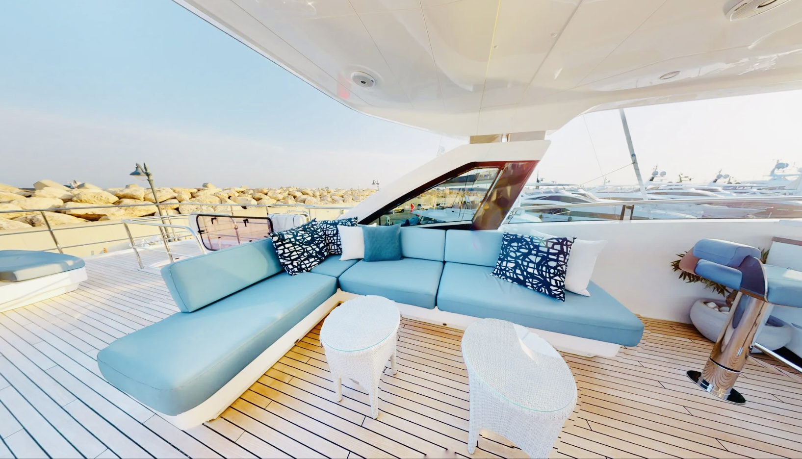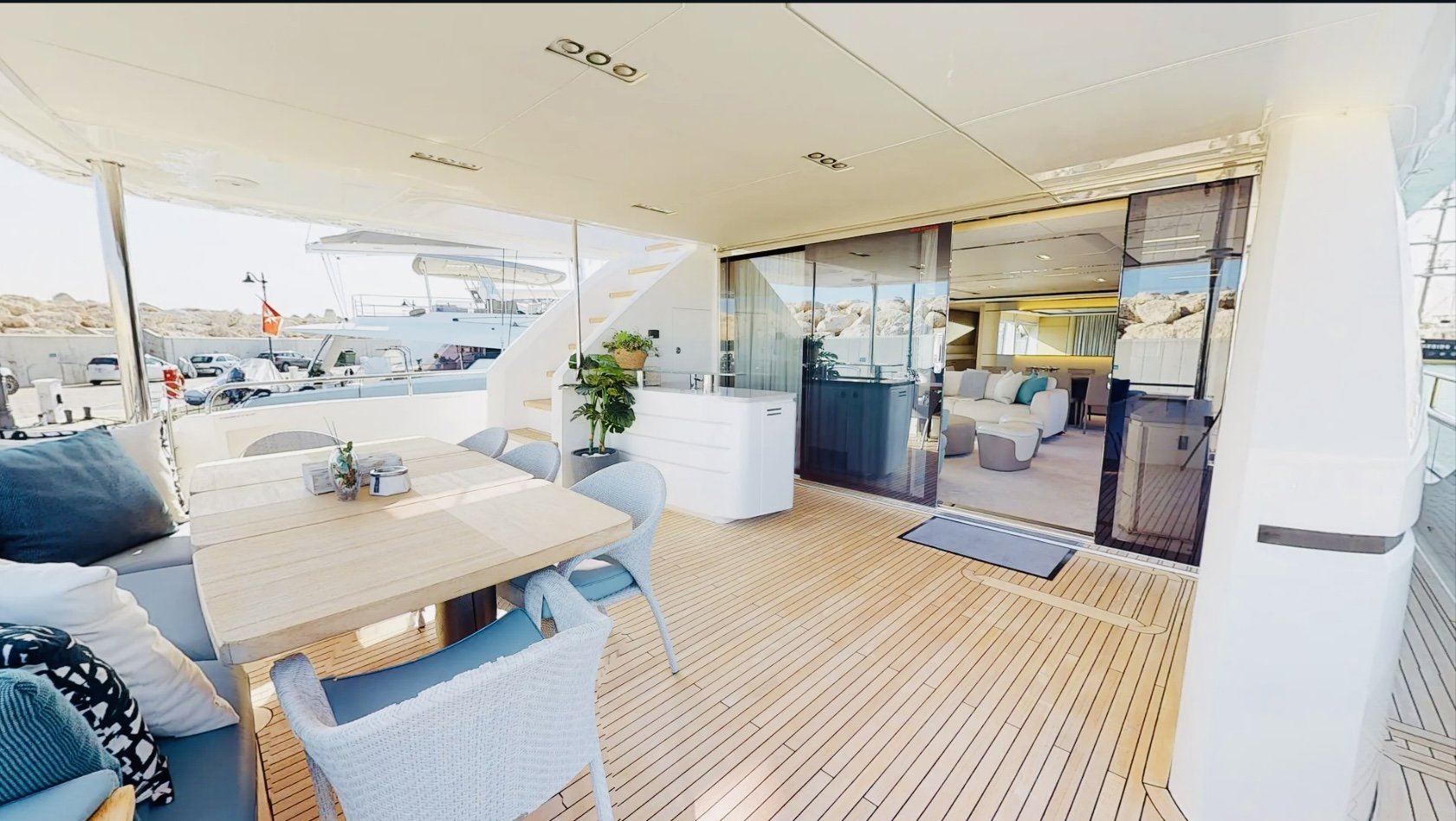 Inside, the main salon features a custom decor with an alluring light scheme, combining ivory white furnishings with accents of marine sea blue and pale wood. The spacious open-plan saloon boasts a generously proportioned lounge area that takes advantage of the panoramic views through customized sliding doors. The mid-positioning of the salon provides a triple aspect, allowing an abundance of natural light to filter through. The oval dining table can seat up to 10 guests.